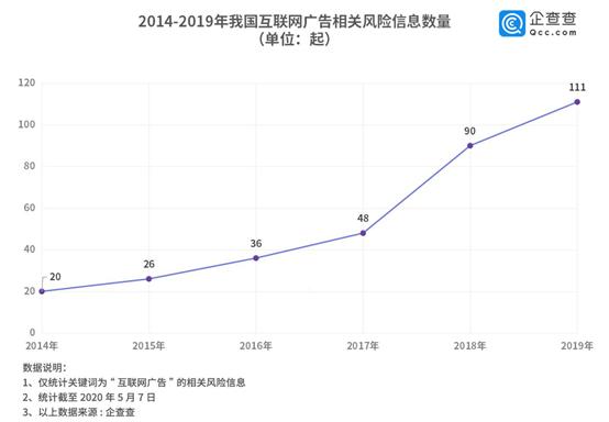 与传统营销领域内的市场竞争格局不同,互联网广告行业市场准入门槛相对较低,政策管制相对宽松,行业集中度相对较低,近几年互联网广告相关风险信息数量也在逐步增长。企查查数据显示,2014年我国仅有20起互联网广告的风险事件,而2019年已经达到了111起,但技术依旧是拓展互联网广告发展空间的深层动力,5G商用的推行也给互联网广告带来无限可能,如何巧妙借力5G互联网的推行提高互联网广告业的集中度是行业面临的问题。