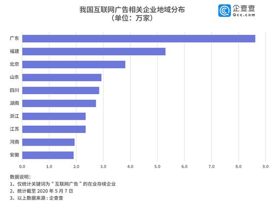 我国从2000年开始就在北京、上海、广东三地选择了部分知名度较高的网络公司,开展了互联网广告经营登记试点工作,探索互联网广告的有效监管方式,为制定互联网广告法规做准备。企查查数据显示,截止到目前,我国互联网广告相关企业最多的省份为广东,企业数量达到了8.6万家,福建、北京次之,各省份互联网广告相关企业的数量与各地规范政策出台和互联网经济发展程度息息相关。