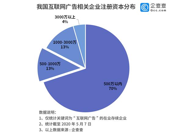 近几年,“增长”一直是互联网广告行业的主旋律,互联网技术不断迭代发展的属性持续吸引广告主的投放兴趣,头部效应得以凸显。2019年阿里巴巴、字节跳动、百度、腾讯等企业集中了中国互联网广告超90%的份额,较2018年同期增长了1.75个百分点,这意味着市场留给头部企业之外的蛋糕仍在缩减,然而这部分企业数量却是占了总量的大部分。企查查数据显示,注册资本在500万以下的互联网企业占据了70%,注册资本在3000万以上的企业则占据了4%。