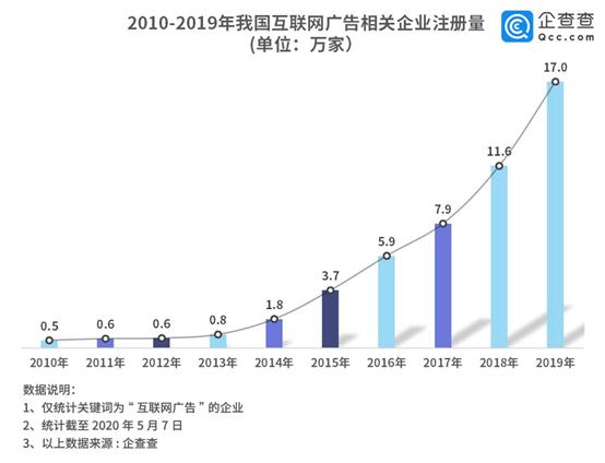 从2014年开始,我国互联网广告相关企业注册量稳步增长,2019年达到17万家,较2018年增长了46%。AI、大数据、智能投放等创新技术的普及应用,不仅创生了一批独角兽营销平台,而且大幅拉低了广告投放门槛,拓宽了广告市场空间,因此2019年广告业总体向好,广告经营单位及广告从业人员结构经过调整,逐渐进入良性发展轨道。