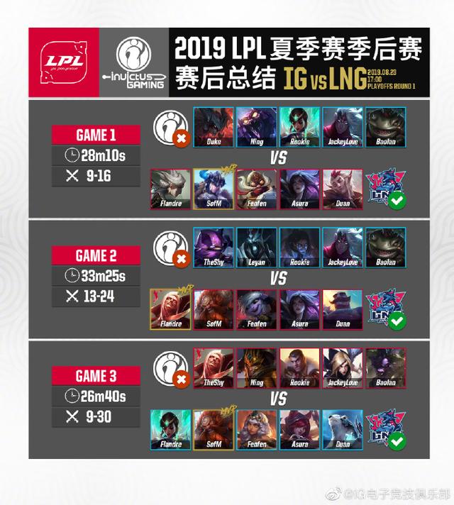 但IG在常规赛也跌跌撞撞,最终以9胜6负的成绩搭上夏季季后赛末班车。但在季后赛首轮就爆冷被LNG以3:0零封,止步八强,也使得粉丝们期待的电竞元宵晚会即季后赛下一轮IG对阵RNG也被迫取消。