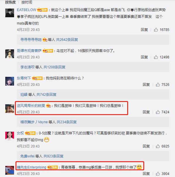 而在RNG不敌EDG止步八强后,毫无意外地上了热搜,甚至网友们都调侃小猪罗志祥要感谢RNG帮忙转移火力。RNG俱乐部官博也迅速遭到粉丝爆破。而从粉丝们的评论来看,基本都是批评和嘲讽RNG队员的糟糕表现,并且开始想念春季赛未登场的Uzi。
