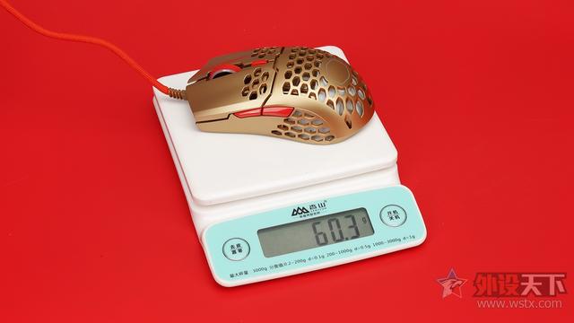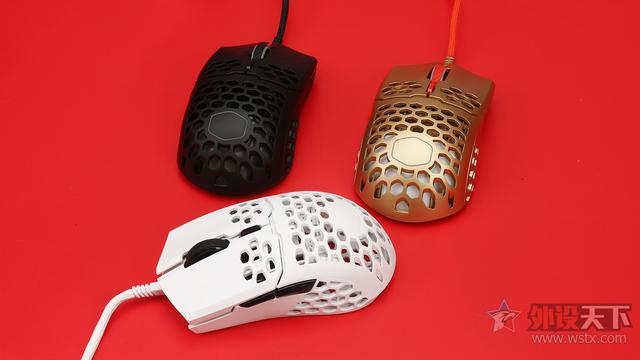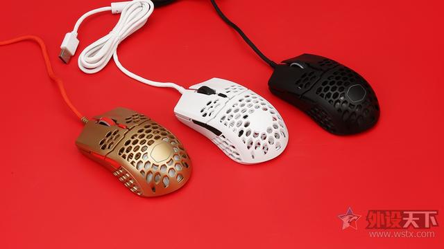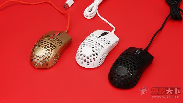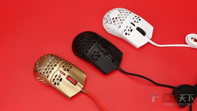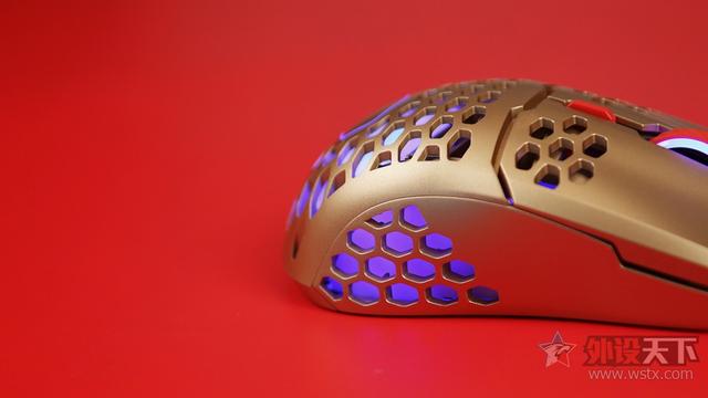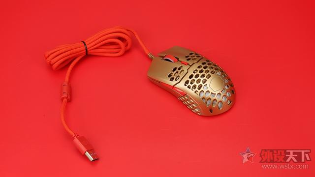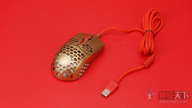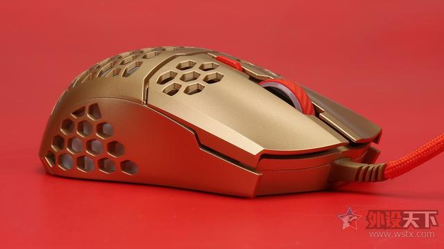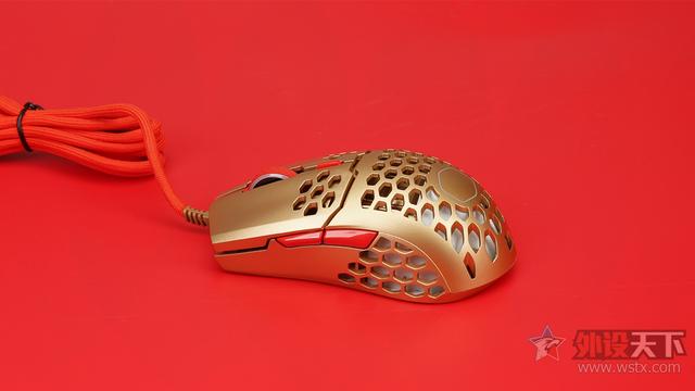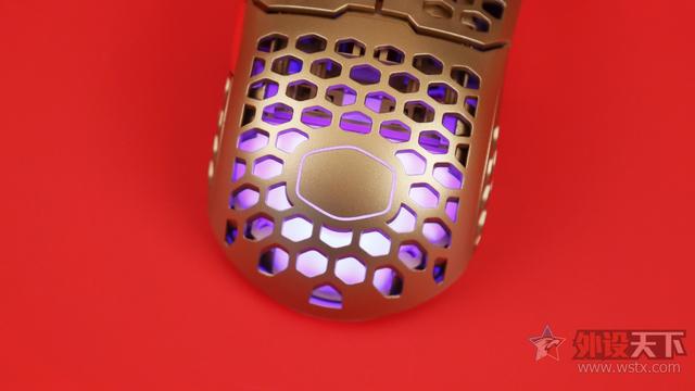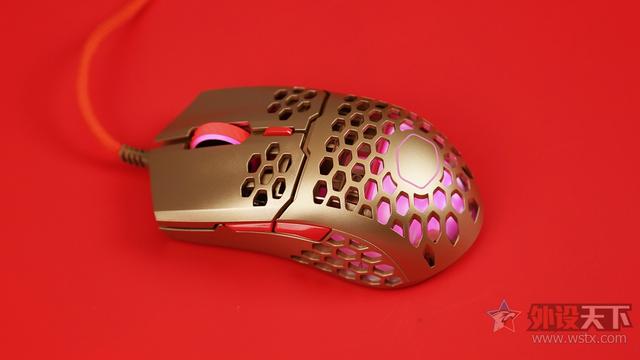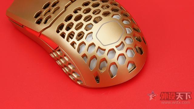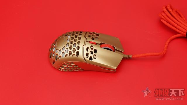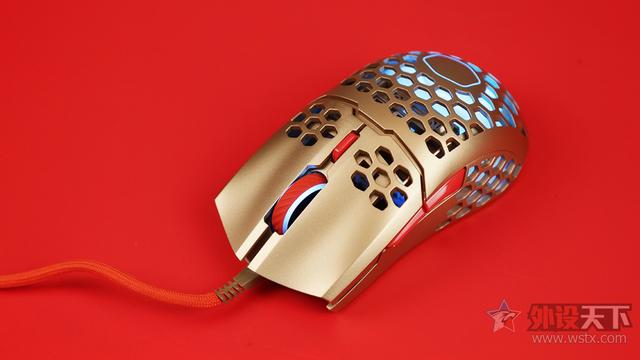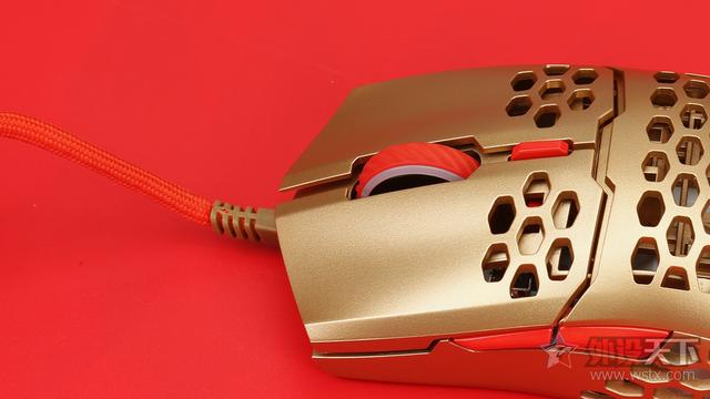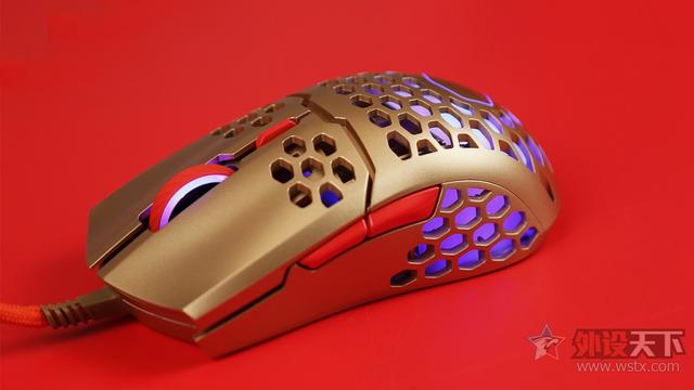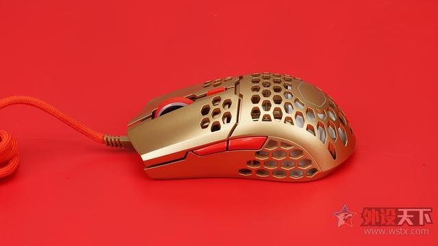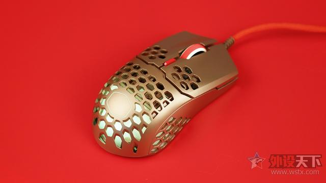 酷冷至尊MM711鼠年限定版游戏鼠标整体采用了金色作为鼠标机身配色、侧键、滚轮以及DPI按键则是采用了红色进行点缀,金色机身也让鼠标看起来十分奢华,红色恰到好处的点缀也起到了画龙点睛的效果,视觉效果表现出众,十分夺人眼球。外观造型上采用了对称式设计,整体十分小巧,在掌心、按键和侧裙位置均采用了六角形蜂巢的镂空设计,