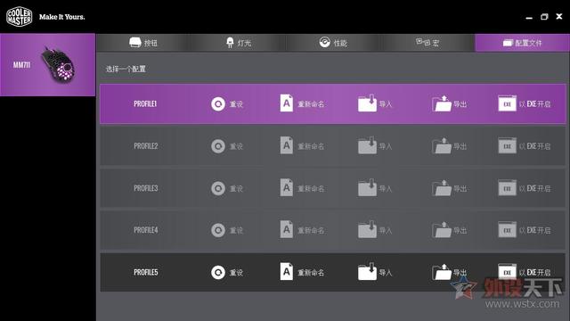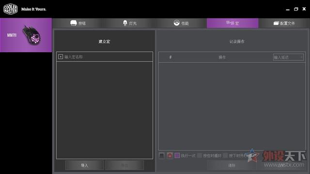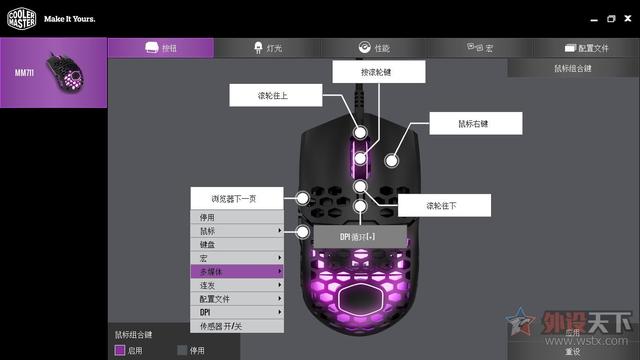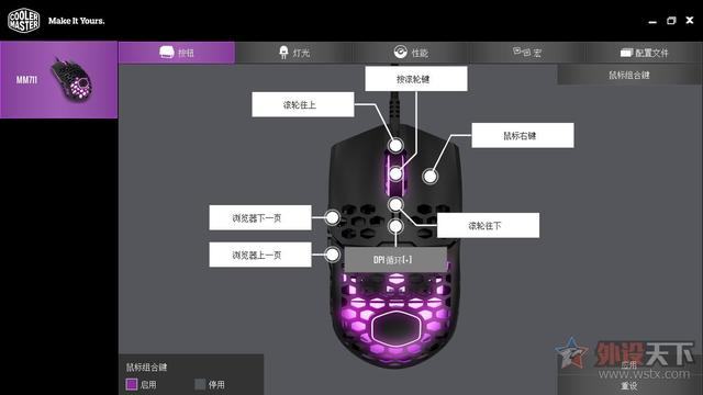 通过酷冷至尊的驱动程序,我们也可以对鼠标参数进行设定,驱动界面设计简洁,分成了按键、灯光、性能、宏以及配置文件五大项。按键设置界面我们可以对按键进行自定义设置,驱动内也提供了丰富的可选项供用户选择。