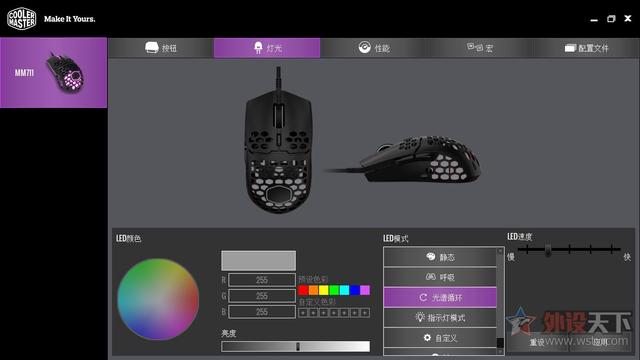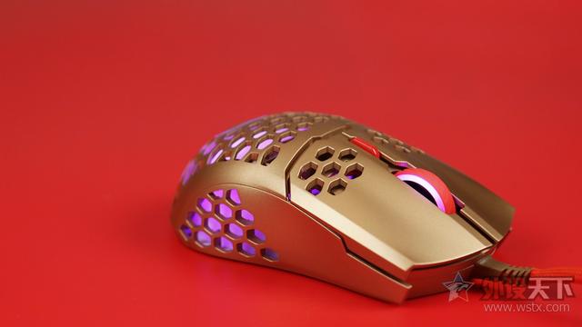 酷冷至尊MM711鼠年限定版游戏鼠标灯光方便处理也较为出色,灯珠的亮度透过柔光罩后十分柔和,颜色、动态效果表现都很不错,透过机身的镂空设计,也能为用户桌面上增添更好的视觉观感。