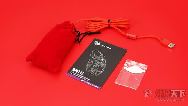 附件方面,则是提供了产品说明书,替换脚贴,鼠标则是采用红色的保护袋进行包裹。