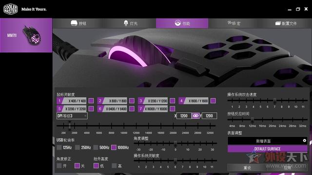 性能界面则是提供了鼠标DPI参数、回报率、角度修正、提升高度以及表面校准等功能,设置选项丰富,方便用户根据个人使用习惯来进行调节。