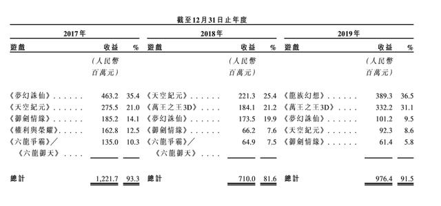 祖龙娱乐自2016年年底便推出了五款主打产品,分别是《梦幻诛仙》、《天空纪元》、《御剑情缘》、《权力与荣耀》及《六龙争霸》。其中,《梦幻诛仙》在2017年受到市场追捧,并为公司带来4.63亿元收入,占总收益35.4%。紧随其后的是《天空纪元》,其创造了2.75亿元收入,占总收益21%。然而,这两款游戏在随后两年的热度及收益都有所下降,意味着公司的主打游戏的生命周期基本上在三年左右。