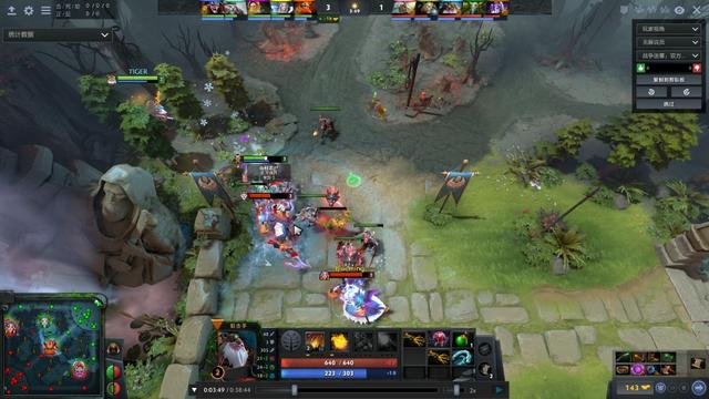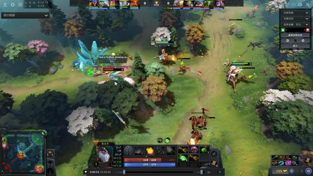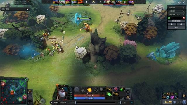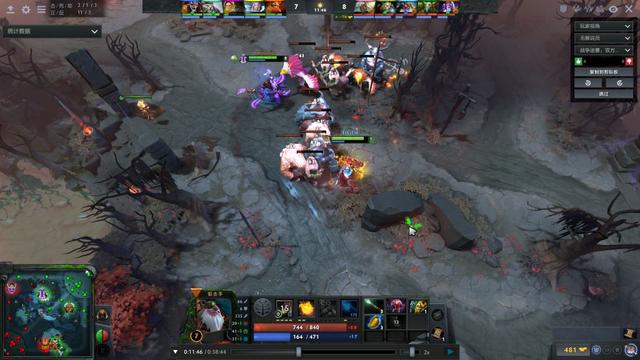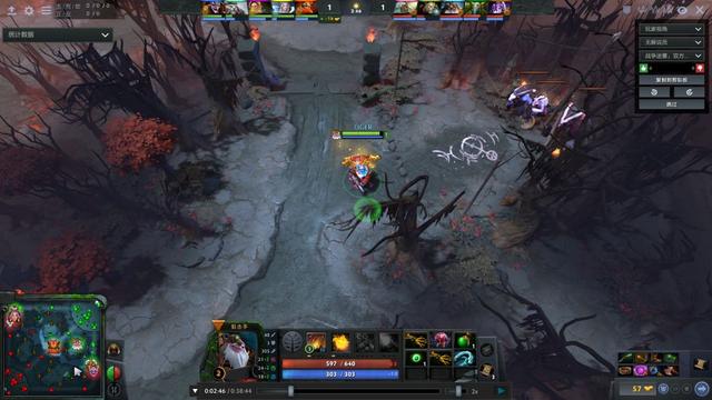 伐木机因为线上要频繁拉小兵仇恨叠被动,所以天辉兵线前推进塔。火枪判断chen要拉野控线,所以这时候去野区先干扰了光法拉小野,在1:54的时候又干扰了光法拉右侧大野点的双野,陈在塔下吃到了完整的3波兵线。