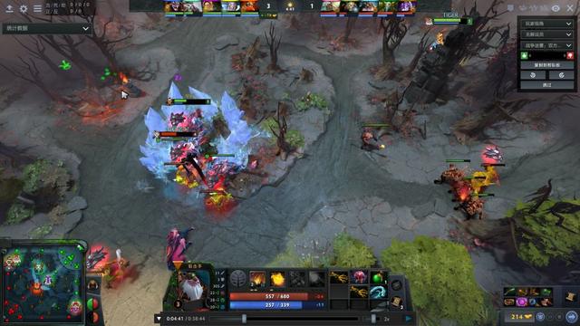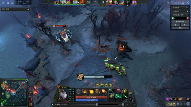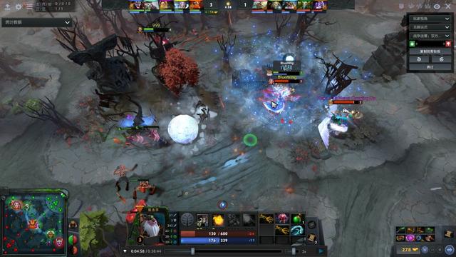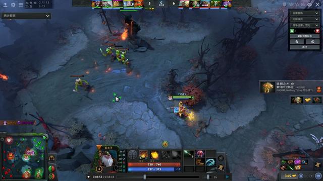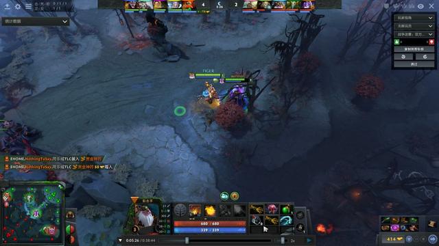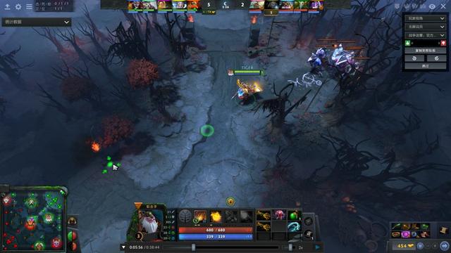 从TP的树林一直沿左侧绕到现在的位置,此间一直没有出现在对方视野里。本来海民冰女准备动手狼人,被铺了霰弹之后如果强行击杀狼人会被反杀,遂作罢。此时夜魇兵线马上推进对方一塔,所以3:54的时候火枪拉了一波右侧野(失误了没拉出来)准备接兵线。