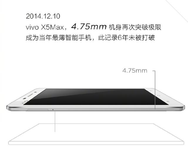而最极限的vivo X5Max则以4.75mm突破极限成为了当年最轻薄智能手机,该记录甚至保持了6年也未被打破。可见在轻薄的极致程度上,vivo X系列一直都有很好的呈现。