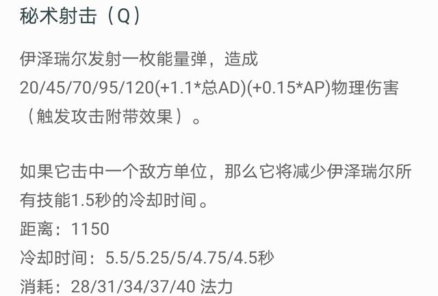 Q技能是EZ的核心输出手段,本身就具有很高的ad和ap加成,使得Q技能伤害非常可观。除此之外,如果Q技能命中敌方英雄,可以减少所有技能的1.5S冷却时间。这也是EZ秀的一个基础。通过不断地使用Q技能命中地方英雄,使得自己的E技能尽快冷却完毕,拉开距离继续进行风筝,这是EZ最主要的一个玩法。