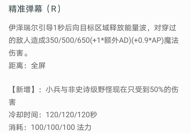 R技能是英雄联盟当中少有的全图技能,可以向地图上的任意一个位置释放。这个技能依然有着ad和ap加成,在团战的时候,命中到地方很多人的话,也能够造成非常可观的伤害。除此之外,R还有一个非常特殊的机制,就是它的释放不会被控制技能打断,虽然它一段很长时间的引导过程,很容易被人躲避,但是,只要EZ在释放R过程中,不阵亡,EZ的R技能一定会在原地释放出去。