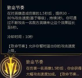 在没有了偷钱之后,EZ符文是非常灵活的。在一些高端局中,常见的EZ符文有征服者、致命节奏这两种主流,这两者也各有利弊。征服者主要打持续作战,主要点出一些吸血符文,并且出破败、饮血剑等一些吸血的装备,可以在残血的情况下迅速吸满,可以做到丝血反杀的局面。致命节奏主要在Q技能都过程中穿插平A,依赖破败的效果,在后期打坦克的过程中,也可以做的更好。