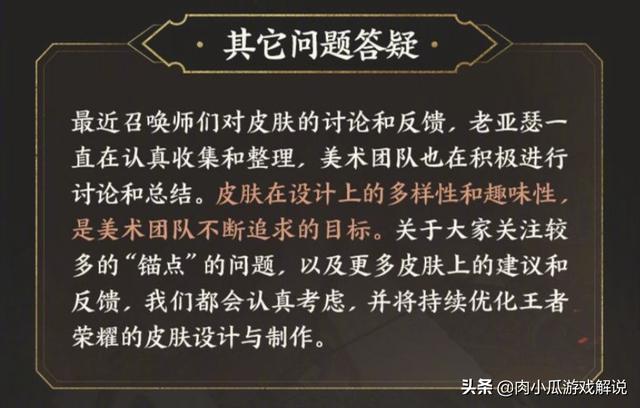 一时间玩家的怒气就往王者荣耀官方的公告下面发泄,纷纷表示要求王者荣耀的策划关女士离开王者荣耀,并且表示拒绝锚点,王者荣耀中没有锚点的皮肤都比较出色,而加了锚点的皮肤都非常丑,最终官方可能也是听到了玩家的心声,在这一次王者荣耀老亚瑟的答疑中,对锚点事件进行了回应!