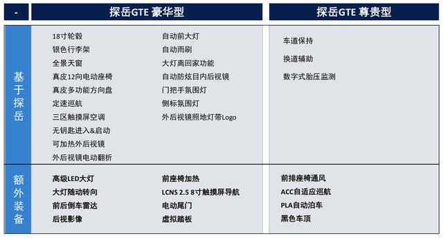 有了探岳上市以来的认可度,探岳GTE更像是站在巨人的肩膀上前进。当然,探岳GTE也拿出了比燃油车更大的诚意。在沟通会上,官方表示探岳GTE将推出豪华型、尊贵型两种规格。二者相比燃油版探岳的同规格车型,配置都更加丰富。特别是没有出现迈腾GTE上的在全液晶仪表,在探岳GTE上是全系标配。