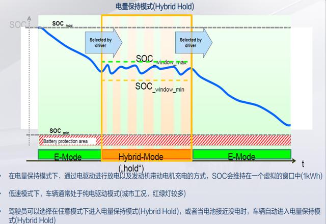 -电量保持模式:发动机为驱动车辆的主要动力,并将电量维持在一定的水平。这种模式下系统会为电池预留1kWh的浮动窗口,在浮动区间内车辆仍会以纯电或混动模式驱动,消耗至窗口下限时,再充电到预设值。简单地说,就是在小范围内反复充放电的过程。