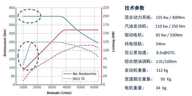 与大众家族其它PHEV车型相同,探岳GTE也采用P2混动架构。动力系统由1.4TSI发动机与集成HEM80驱动电机的DQ400e六挡双离合器变速箱组成,综合输出功率和扭矩分别为155kW与400Nm。同时电动机低转高扭的输出特性,优化了整车在发动机低转速时的动力输出,比纯燃油车型动力响应更迅速。
