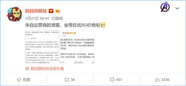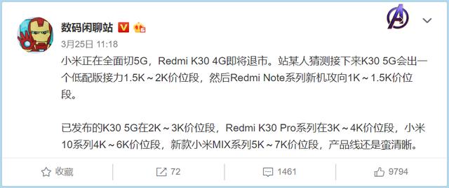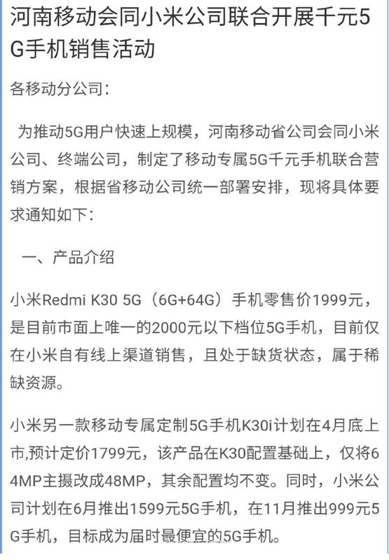 据数码闲聊站的消息来看,中国移动为了推动用户转型5G,将与小米进行战略合作,协议中提到,红米将有一款专属定制的5G手机红米K30i,相比红米K30 5G仅在主摄上进行减配,其余配置保持不变,价格更便宜。
